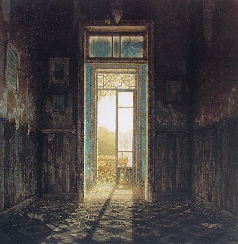 Останахме вътре в захлас, загледани в тези илюзорни интериори, места, забравени от времето, стаи от приказни къщи, изоставени на вятъра, дъжда и слънцето, бликащо винаги от центъра на картината, пречупвайки се през нащърбените стъкла на стар счупен прозорец. Светлината в картините е невероятна, тя идва от този главен източник и сякаш се разлива в пространството, стига до нас и ни дърпа вътре в тази изоставена стая, в този забравен безвременен свят.
